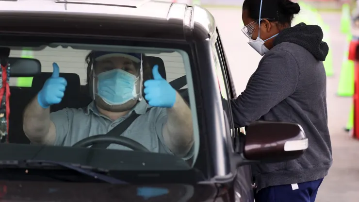 A driver gives a thumbs up as his passenger is given a COVID-19 vaccination by a healthcare worker at a drive-thru site at Tropical Park on January 13, 2021 in Miami, Florida. Joe Raedle | Getty Images
