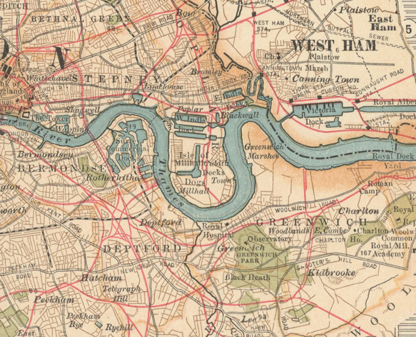 East End of London along the River Thames (c. 1900), detail of a map in the 10th edition of the Encyclopædia Britannica