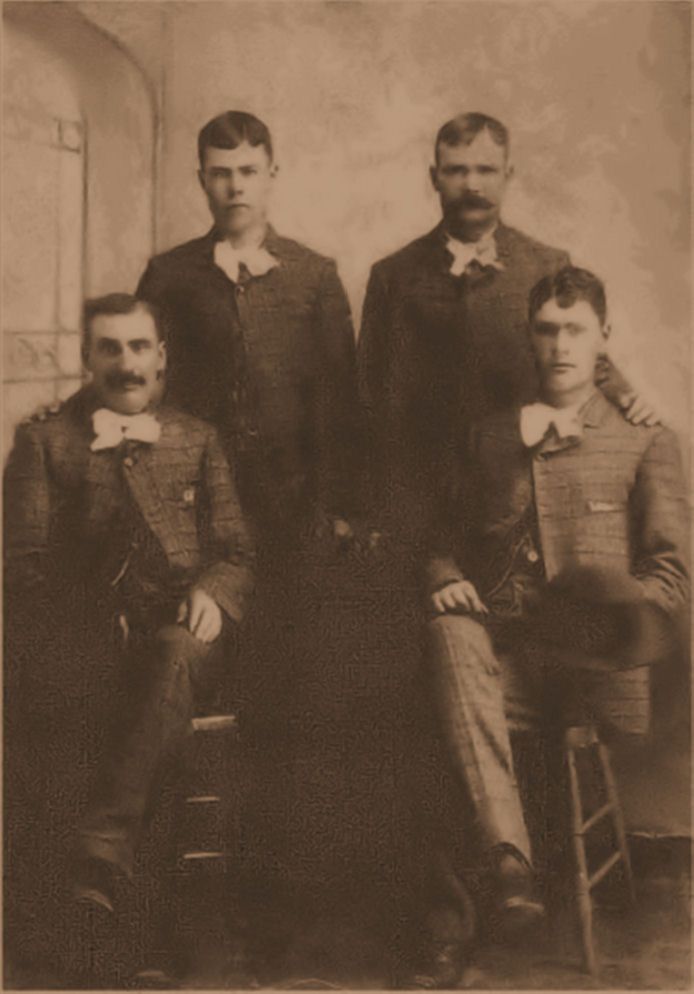 Stockton - Eskridge gang in 1880 in Durango, CO. Left Standing: Harg Eskridge, Left Seated: Byson Eskridge, Right Standing: Port Stockton, Right Seated: Ike Stockton