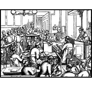 A hearing at the justice room of Mansion House, early nineteenth century.