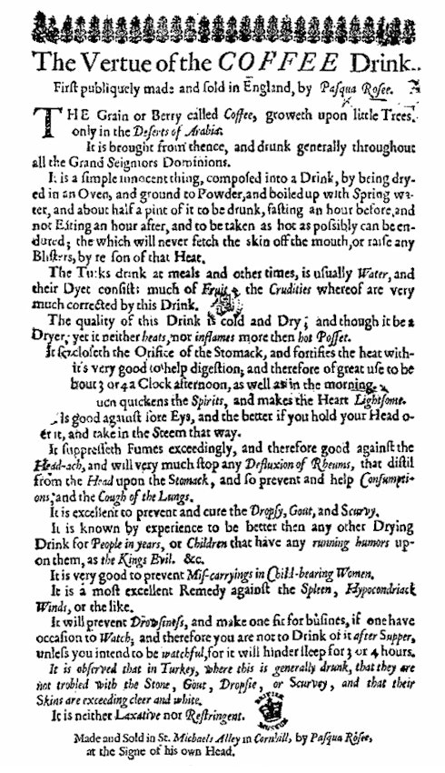 An advert published in 1652 to promote the launch of Pasqua Rosée’s coffeehouse, first of it's kind in London. Date: 1652