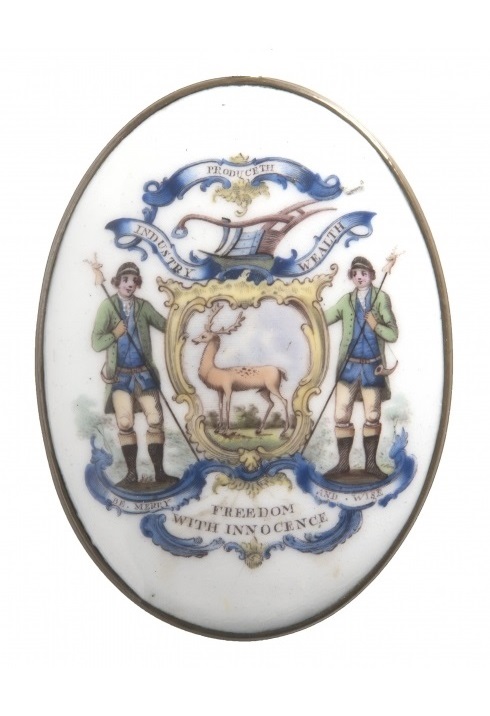 An enamel badge showing the coat of arms of the Most Ancient and Honourable Society of Bucks. The reference to innocence is presumably tongue-in-cheek.