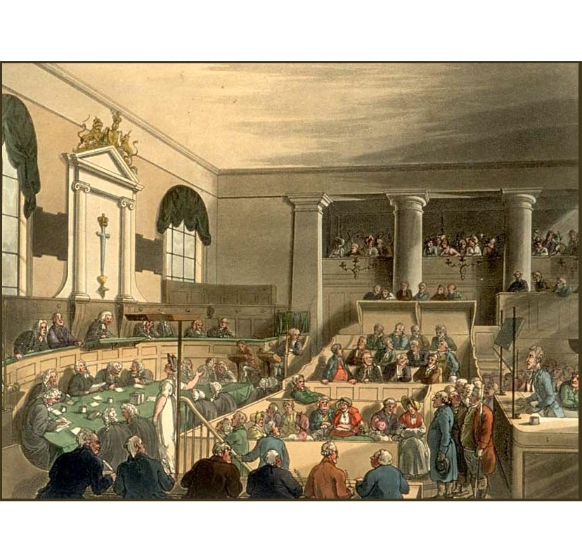 An illustration of a trial at the Old Bailey Sessions House in 1808