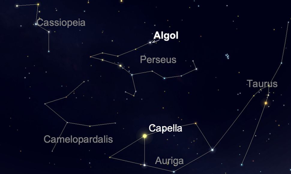 The variable "Demon Star" Algol is located in the Perseus constellation. (Image credit: SkySafari/Simulation Curriculum) .